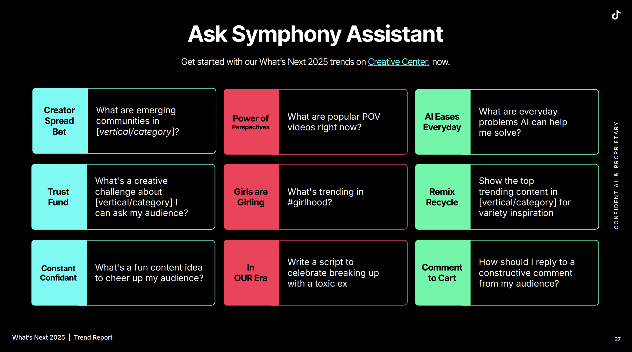 หรือใครที่ต้องการผู้ช่วยบน TikTok ในการหาไอเดีย หรือช่วยสร้างคอนเทนต์ที่มีสว่นผสมของเทรนด์ปี 2025 ก็สามารถใช้แอ็กเคานต์ TikTok Business ในการเข้าไปใช้งาน ‘Symphony Assistant’ ใน Creative Center ได้เลย!