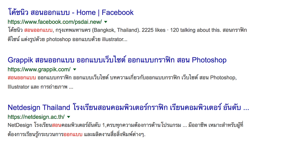 หน้าแรกจะเล่นคำว่า สอนออกแบบ ถ้าเราลองไปค้นหาดูใน Google จะเจออยู่อันดับที่ 2 ตามรูปภาพด้านล่าง
