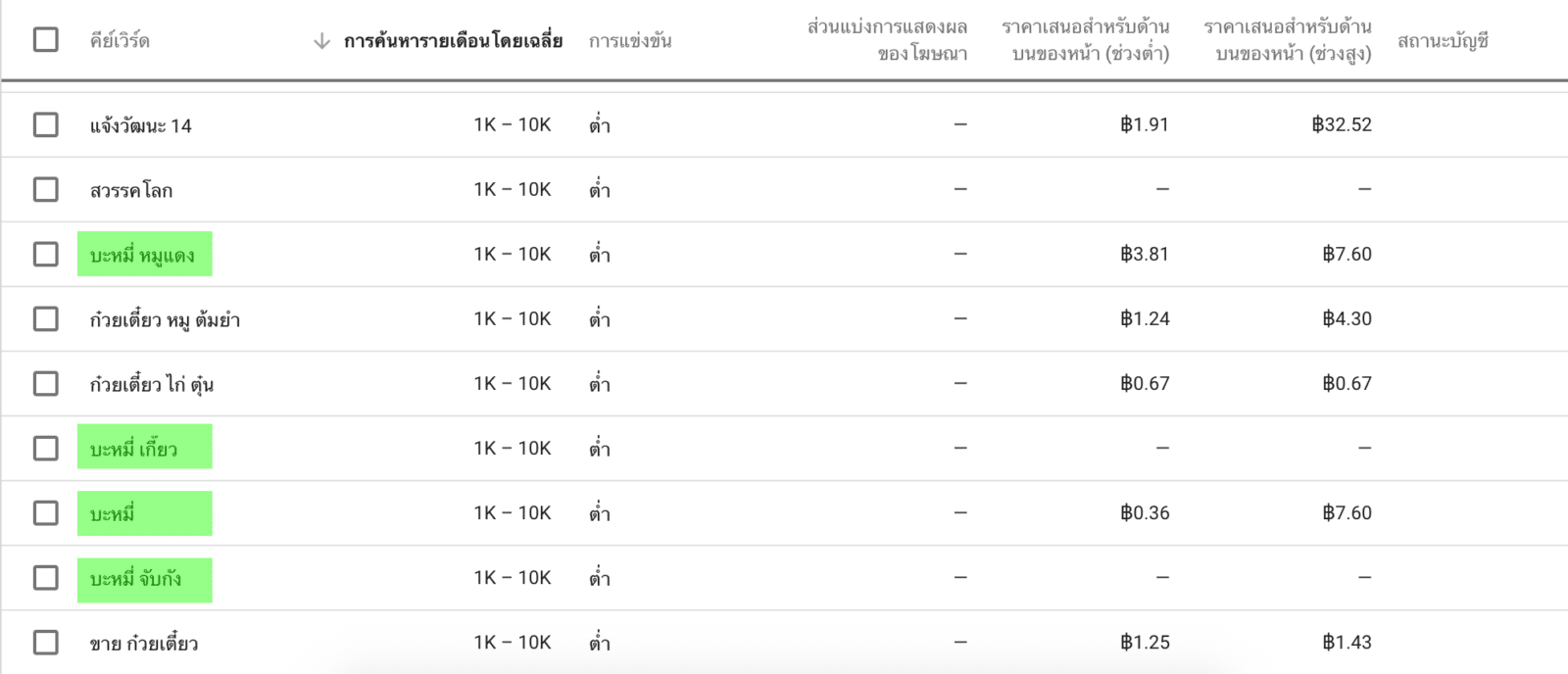 ลองใส่คำว่า บะหมี่อร่อย กับ ร้านบะหมี่ ทาง Google Keyword Planner ทำการหา Keyword ที่มีคนค้นหาออกมาให้ดูว่าคำไหนมีการค้นหาประมาณเท่าไหร่บ้าง ถ้าดูจากภาพคำค้นหาที่ใกล้เคียงที่สุดก็คือ บะหมี่หมูแดง และ บะหมี่เกี๊ยว ซึ่งสามารถนำคำไหนก็ได้ไปเป็น Keyword หลักในการเล่น SEO กับบทความนั้นๆ