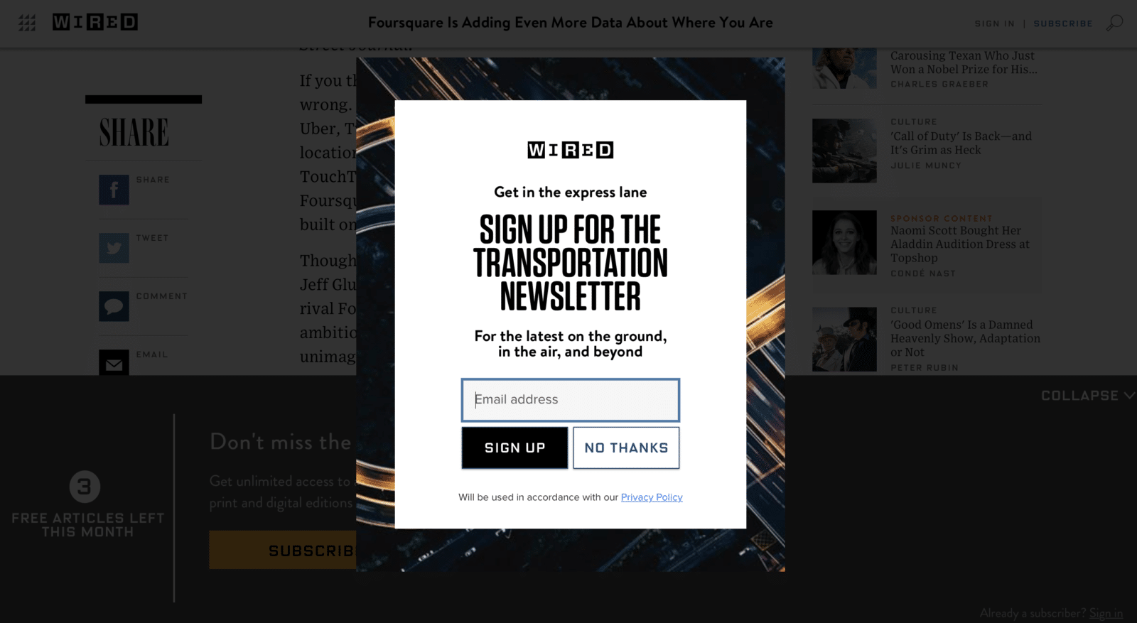 ซึ่งวิธีการแบบนี้อธิบายง่าย ๆ เลยก็คือปกติแล้ว Wired จะมีโควต้าให้ผู้ใช้ทั่วไป (ที่ไม่ได้สมัครรับข้อมูล) อ่านบทความได้จำนวนหนึ่งเท่านั้น เช่น 3 บทความ 5 บทความ ต่ออาทิตย์ แต่สิ่งที่ Wired ทำในครั้งนี้คือการให้ WeTransfer มาจ่ายค่า Pay Wall ให้กับบทความบทความนึง แล้วบอกว่าที่ได้อ่านเป็นเพราะว่า WeTransfer เป็นคนสนับสนุนคอนเทนต์ตัวนี้