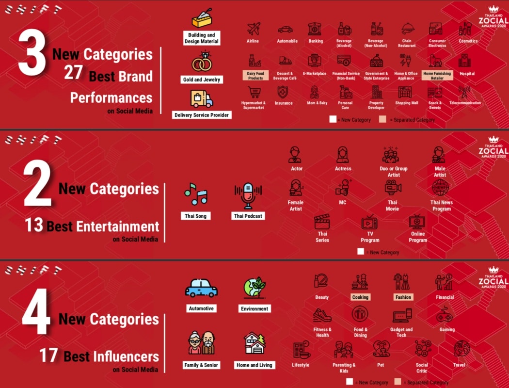 Thailand Zocial Awards 2020 ครั้งนี้แจกทั้งหมด 195 รางวัล แบ่งเป็น 5 กลุ่ม ได้แก่