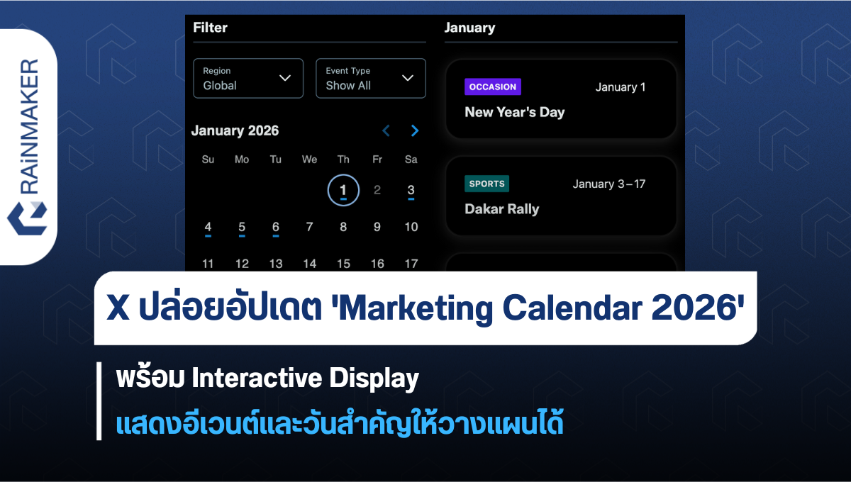 สำหรับครีเอเตอร์หรือแบรนด์ไหนที่มีแอ็กเคานต์สำหรับทำการตลาดบน X แล้ว นี่น่าจะเป็นการอัปเดตสำคัญที่ทำให้การวางแผนการทำการตลาด โปรโมชัน หรือวางกลยุทธ์ได้ง่ายขึ้น เพราะมีอัปเดตอย่าง ‘Marketing Calendar 2026’ มาไกด์ให้แล้วว่าจะมีอีเวนต์หรือวันสำคัญอะไรที่เกิดขึ้นในแต่ละเดือนบ้าง