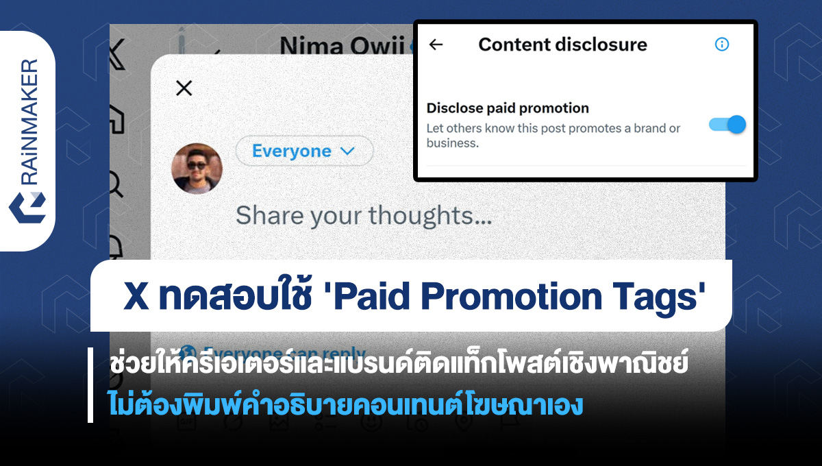 ซึ่ง Paid Promotion จะเป็นตัวเลือกแท็กแบบ Label ใหม่ในโพสต์ ที่แสดงว่าโพสต์นั้นคือโพสต์ที่ถูกโฆษณาและมีค่าตอบแทนทางการตลาด โดยระบบจะช่วยแสดงแท็กแบบไม่ต้องพิมพ์เอง เช่น #ad หรือ #sponsored เป็นต้น เพื่อช่วยให้การ Disclose ง่ายขึ้น และผู้ใช้จะได้รู้ว่านี่คือโพสต์ที่เกี่ยวข้องกับโฆษณา และแพลตฟอร์มดูโปร่งใสด้วย