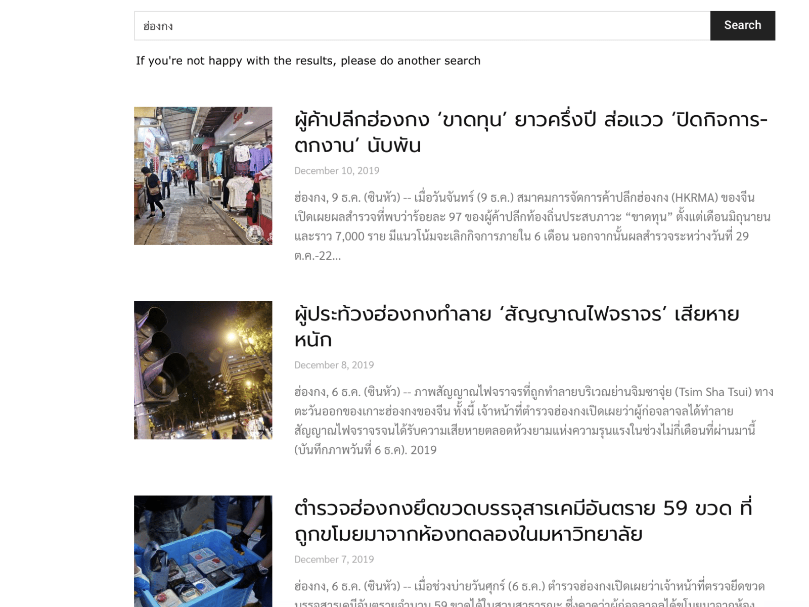 แน่นอนว่า Topic ใหญ่ในช่วงนี้ที่เกี่ยวกับจีน คงหนีไม่พ้นประเด็นเรื่องฮ่องกง ซึ่งเราก็ลองค้นหาดูว่ามีข่าวอะไรที่เกี่ยวกับฮ่องกงบ้าง ซึ่งสิ่งที่น่าสนใจก็คือ เราได้เห็นการนำเสนอข่าวที่แสดงในมุมความเสียหายที่เกิดจากการประท้วงฮ่องกง ไม่ว่าจะเป็น การทำลายสมบัติสาธรณะ ผลกระทบต่อเศรษฐกิจ และความรุนแรงต่าง ๆ