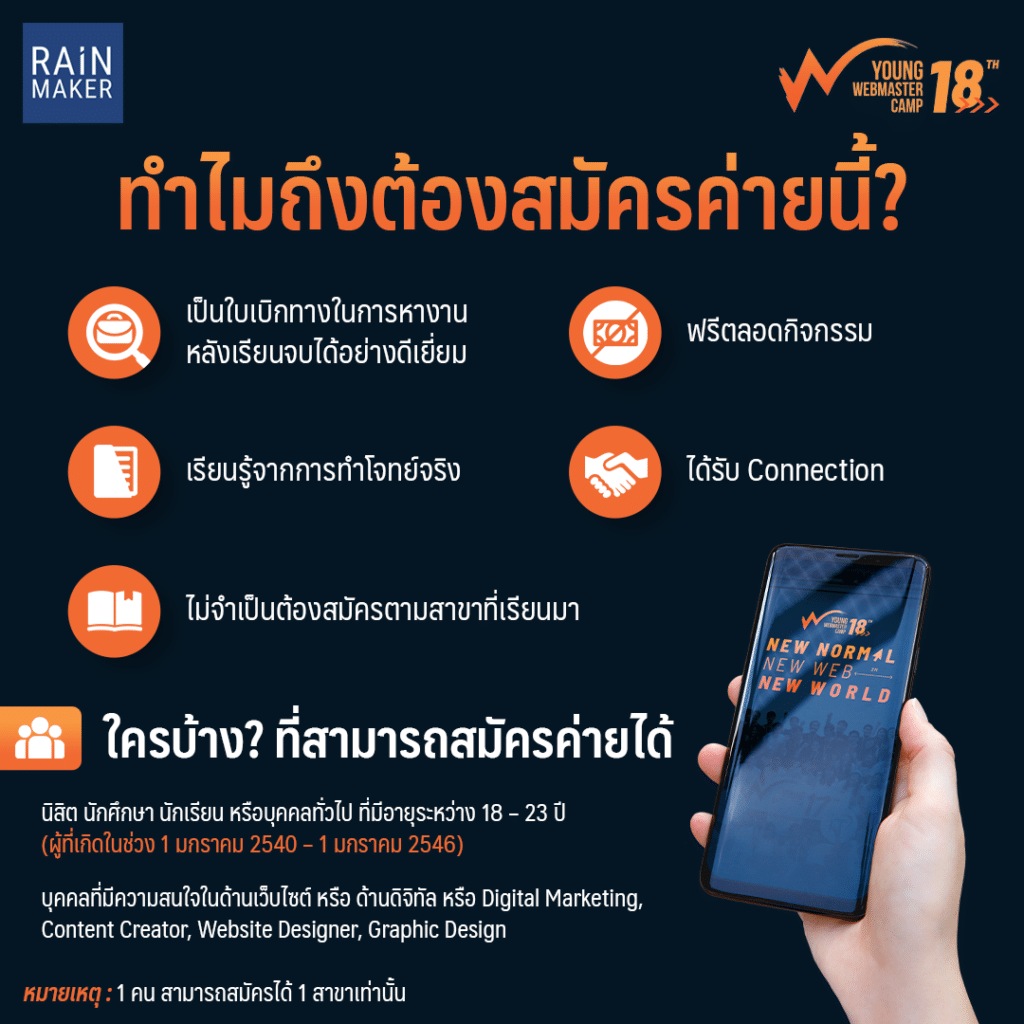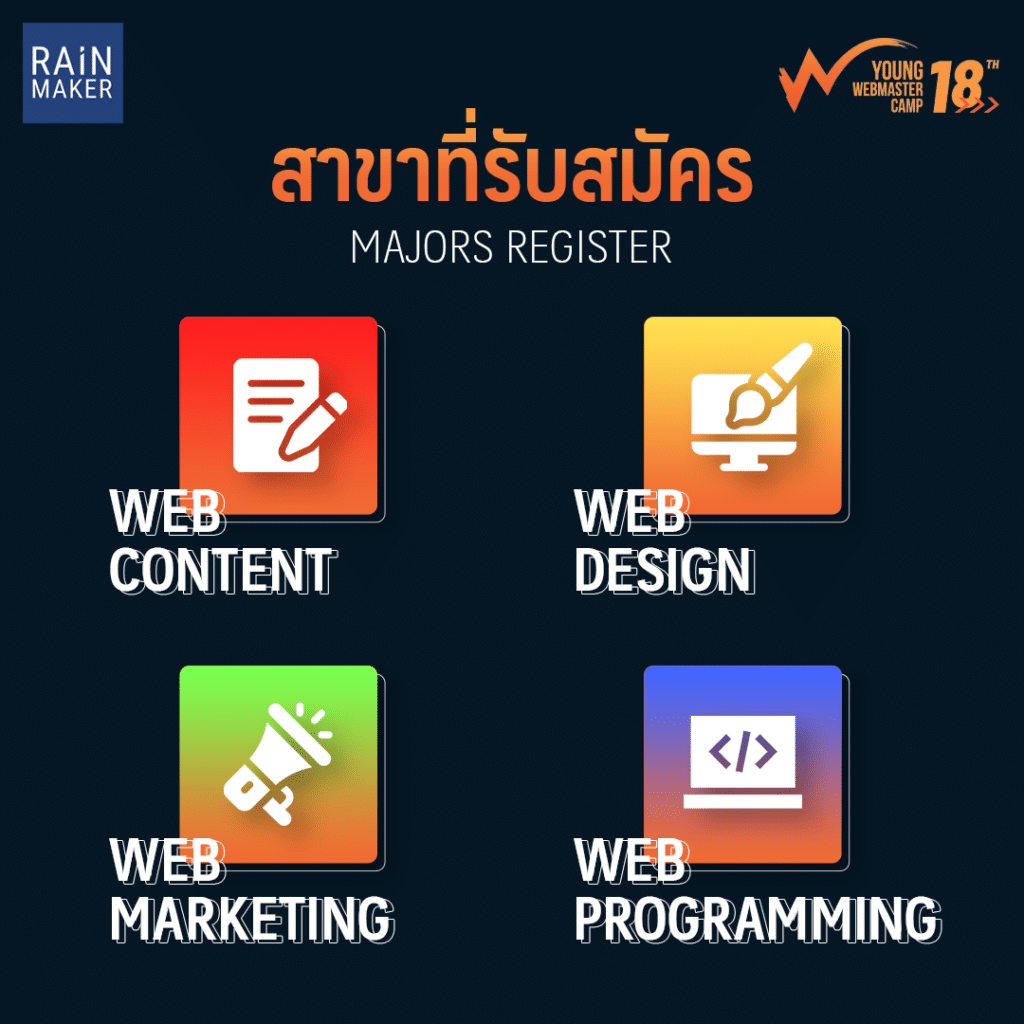 และในปีนี้ ได้จัดขึ้นภายใต้หัวข้อ “New Normal, New Web, New World” ออกแบบวิถีชีวิตใหม่ๆ ให้คนในสังคมผ่านพ้นวิกฤติ Covid-19 โดยจะเปิดรับทั้งหมด 4 สาขาด้วยกัน สาขาละ 20 คน ดังนี้