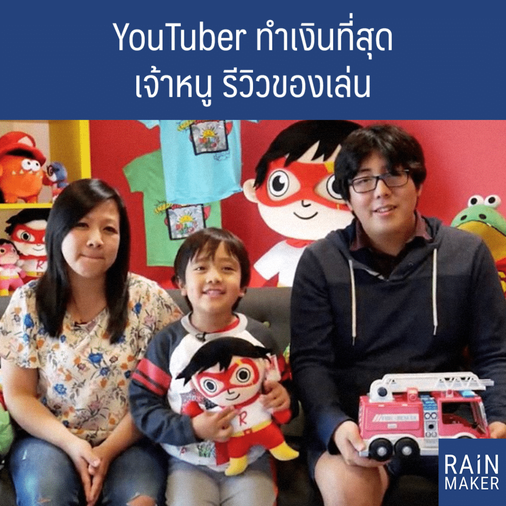 Forbes จัดอันดับยูทูบเบอร์ที่ทำรายได้มากที่สุดในปี 2018 และอันดับ 1 ก็คือเจ้าหนูวัย 7 ขวบและครอบครัว ช่อง Ryan Toysreview ผู้ติดตาม 17 ล้านคน โดยคาดการรายได้ที่เกิดขึ้นเฉพาะบนยูทูบ 22 ล้านเหรียญสหรัฐ