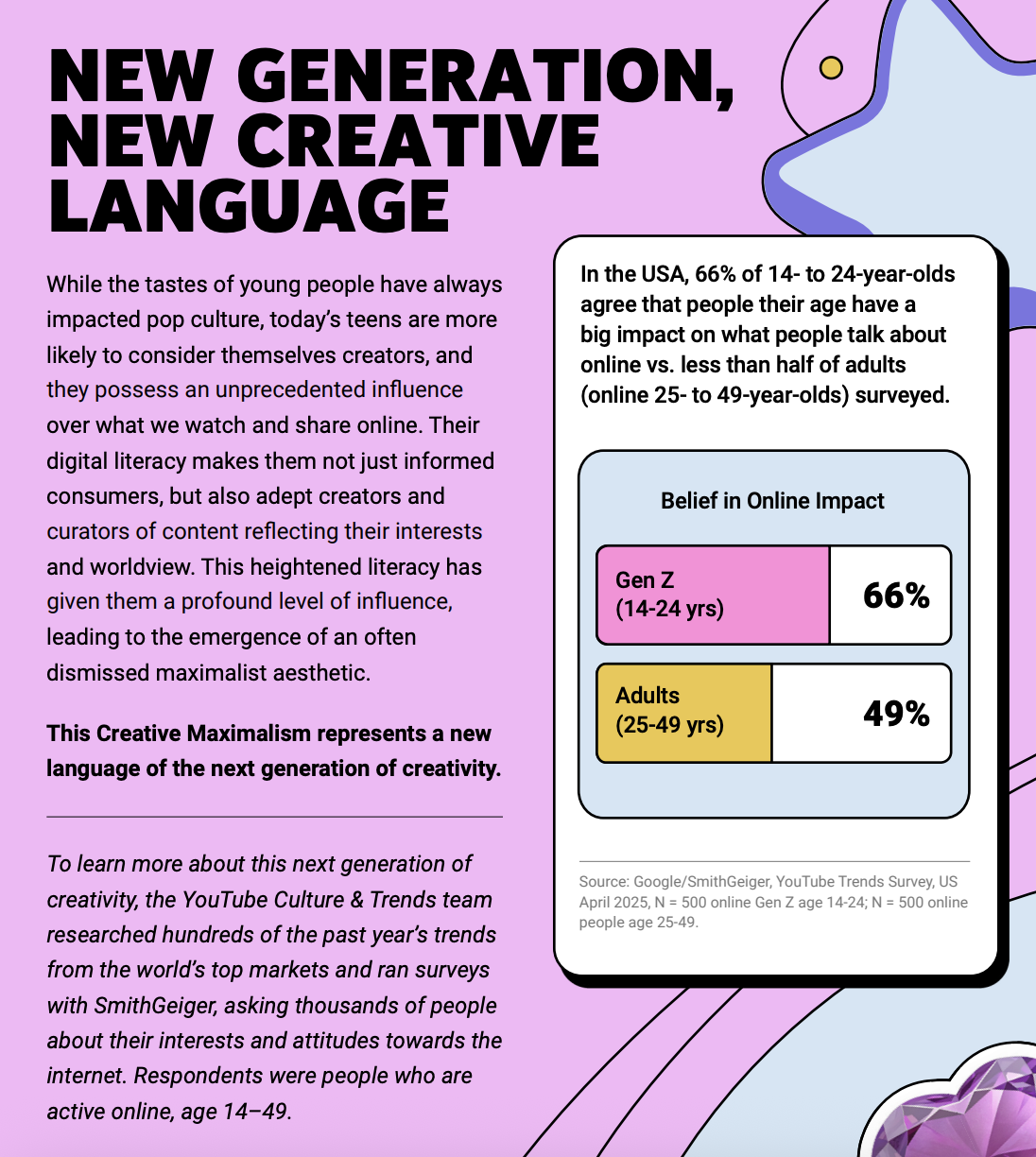 โดยสรุปจากแบบสำรวจแล้ว กลุ่มคนเจนใหม่นั้นมีการเปิดรับเทรนด์ มีม และวัฒนธรรมที่หลากหลายมากขึ้น ทำให้สิ่งที่เกิดขึ้นในโลกโซเชียลมีอิทธิพลต่อความสนใจคอนเทนต์บน YouTube ไปด้วย ฉะนั้นครีเอเตอร์สาย YouTuber ก็ต้องเปิดรับเทรนด์ แต่ก็ต้องชัดเจนในเอกลักษณ์ของช่องและความเป็นตัวเองเพื่อที่จะสื่อสารกับกลุ่มคนเจนนี้ไปด้วย