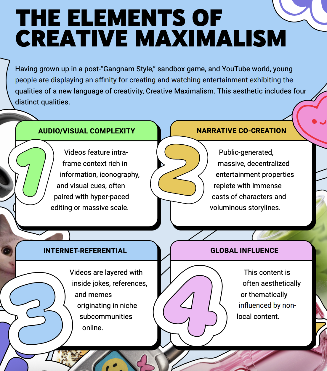 จากผลสำรวจของพฤติกรรมคนเจนใหม่สามารถสรุปมาเป็น ‘The Elements of Creative Maximalism’ สำหรับคีย์หลักในการทำคอนเทนต์และทำให้วิดีโอบน YouTube น่าสนใจได้มากขึ้น นั่นก็คือ