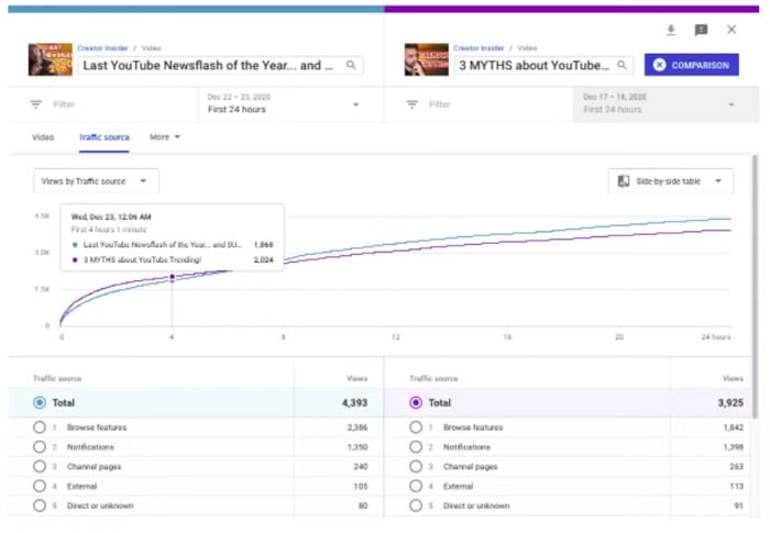 นอกจากนี้ยังสามารถนำคลิปวิดีโอมาเปรียบเทียบให้เห็นข้อมูลเชิงลึกของ 24 ชั่วโมงแรกชัดๆ ได้พร้อมกันถึง 2 คลิป ที่จะช่วยให้คุณได้ปรับเปลี่ยนกลยุทธ์และเข้าใขผู้ชมมากยิ่งขึ้น โดยที่ตัวเลือกนี้สามารถใช้ได้กับวิดีโอที่อัปโหลดหลังปี 2019 เท่านั้น และไม่สามารถใช้กับ Live-stream