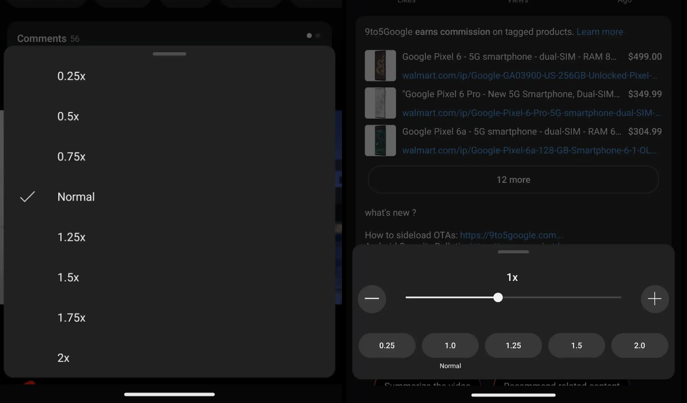 โดยการเปลี่ยนแปลงนี้จะมีผลกับแอป YouTube ทั้งบน Android และ iOS ด้วย ซึ่งจากเดิมที่มีตัวเลือกแบบมีเครื่องหมายติ๊กถูกอยู่ข้างหน้า แล้วสามารถเลือกความเร็วในการรับชมได้แต่ละข้อ เช่น