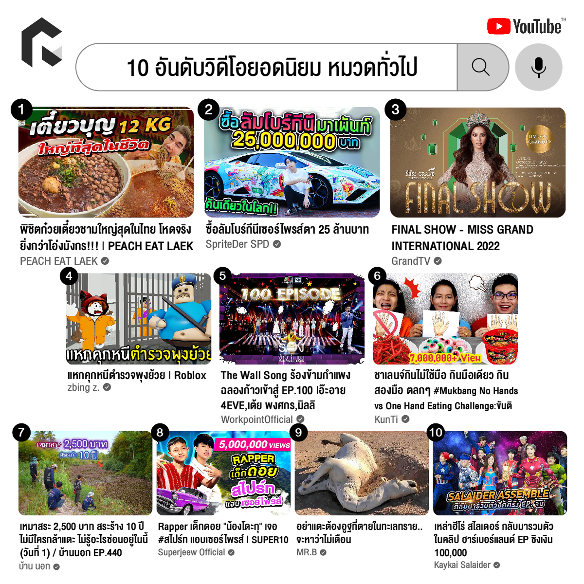 สำหรับวิดีโอยอดนิยม หมวดทั่วไป อันดับ 1 ได้แก่ คลิปจากนักกินจุชื่อดังอย่าง PEACH EAT LAEK กับคลิป “พิชิตก๋วยเตี๋ยวชามใหญ่สุดในไทย โหดจริงยิ่งกว่าโอ่งมังกร!!!” ตามด้วยคลิป “ซื้อลัมโบร์กีนีเซอร์ไพรส์ตา 25 ล้านบาท” จากครีเอเตอร์ยอดนิยมอย่างช่อง SpriteDer SPD