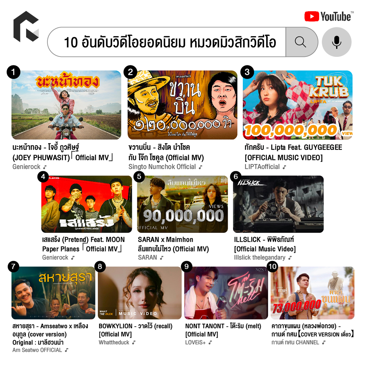 สำหรับวิดีโอยอดนิยม หมวดมิวสิกวิดีโอ อันดับ 1 ต้องเป็นเพลงที่ทุกคนคุ้นหูกันอย่างแน่นอน นั่นก็คือเพลง “นะหน้าทอง – โจอี้ ภูวศิษฐ์” จากช่อง Genierock ที่กวาดไปกว่า 148 ล้านวิว ตามมาติด ๆ กับเพลงฮิตติดหูอันดับ 2 อย่าง “ขวานบิ่น – สิงโต นำโชค กับ โจ๊ก โซคูล” จากช่อง ช่อง Singto Numchok Official กับ 126 ล้านวิว