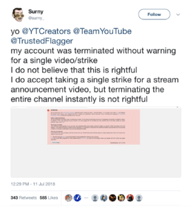 ในขณะที่การแข่งขันระหว่าง YouTube กับ Twitch กำลังดุเดือด Youtuber ได้แก่ Linus Tech Tips, Surny และ Aztrosizt ก็ได้ออกมาบอกว่า YouTube ทำการลบแชแนลของเขาทิ้งเนื่องจากเขาได้ทำการพูดโปรโมต Twitch Stream ในวิดีโอบน YouTube